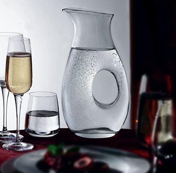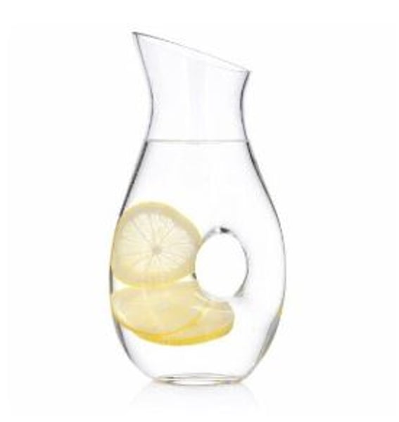 Графін колекції Halo NUDE привертає увагу відсутністю класичної ручки, яка була замінена наскрізним отвором, що проходить через обидві стінки.