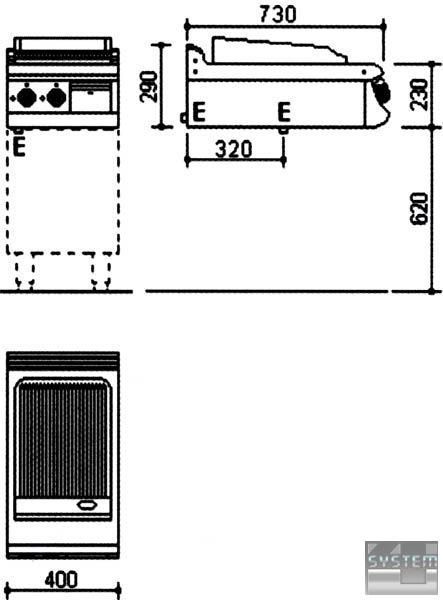 Основна частина зроблена з сатинованого хромонікелевого листа 18/8 н/с, а внутрішні приладдя – з алітованої сталі. Попереду жарочної поверхні знаходиться канал для збору олії та випускний отвір. Зібране з поверхні масло стікає у висувний ящик, який легко чистити. Є борти з трьох сторін для того, щоб запобігти розплескуванню жиру під час смаження. Усі електричні механізми та прилади відповідають міжнародним стандартам. Температура регулюється в межах 50-300 °С за допомогою багаторівневого термостата та запобіжного термостата 350 °C. Основний перемикач використовується для подачі чи припинення енергії. Придатна для багатофункціонального використання із шафою (з дверима або без) або на консолі для установок ізольованого типу.