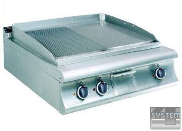 Основна частина зроблена з сатинованого хромонікелевого листа 18/8 н/с, а внутрішні приладдя – з алітованої сталі. Попереду жарочної поверхні знаходиться канал для збору олії та випускний отвір. Зібране з поверхні масло стікає у висувний ящик, який легко чистити. Є борти з трьох сторін для того, щоб запобігти розплескуванню жиру під час смаження. Усі електричні механізми та прилади відповідають міжнародним стандартам. Температура регулюється в межах 50-300 °С за допомогою багаторівневого термостата та запобіжного термостата 350 °C. Основний перемикач використовується для подачі чи припинення енергії. Придатна для багатофункціонального використання із шафою (з дверима або без) або на консолі для установок ізольованого типу.