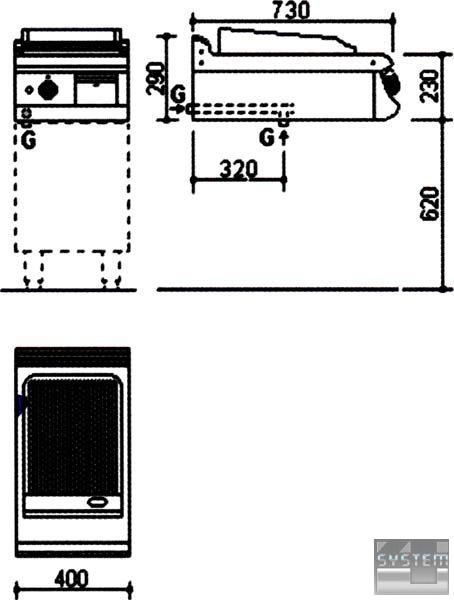 Основна частина зроблена з сатинованого хромонікелевого листа 18/8 н/с, а внутрішні приладдя – з алітованої сталі. Попереду жарочної поверхні знаходиться канал для збору олії та випускний отвір. Зібране з поверхні масло стікає у висувну скриньку, яку легко чистити. Є борти з трьох сторін для того, щоб запобігти розплескуванню жиру під час смаження. Окреме управління жаровні за допомогою 2 окремих ручок. Газові втулки з факелом, мінімальне/максимальне полум'я і термореле; у разі згасання полум'я газовий вентиль припиняє подачу газу. Газові пальники нержавіючої труби придатні для використання різного типу газу. Кнопка автоматичного запалювання. Може бути використаний СНД чи природний газ, і перетворення відбувається без будь-якої модифікації. Придатна для багатофункціонального використання із шафою (з дверима або без) або на консолі для встановлення ізольованого типу.