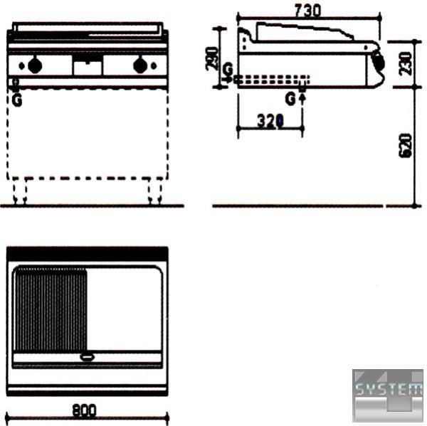 Основна частина зроблена з сатинованого хромонікелевого листа 18/8 н/с, а внутрішні приладдя – з алітованої сталі. Попереду жарочної поверхні знаходиться канал для збору олії та випускний отвір. Зібране з поверхні масло стікає у висувну скриньку, яку легко чистити. Є борти з трьох сторін для того, щоб запобігти розплескуванню жиру під час смаження. Окреме управління жаровні за допомогою 2 окремих ручок. Газові втулки з факелом, мінімальне/максимальне полум'я і термореле; у разі згасання полум'я газовий вентиль припиняє подачу газу. Газові пальники нержавіючої труби придатні для використання різного типу газу. Кнопка автоматичного запалювання. Може бути використаний СНД чи природний газ, і перетворення відбувається без будь-якої модифікації. Придатна для багатофункціонального використання із шафою (з дверима або без) або на консолі для встановлення ізольованого типу.