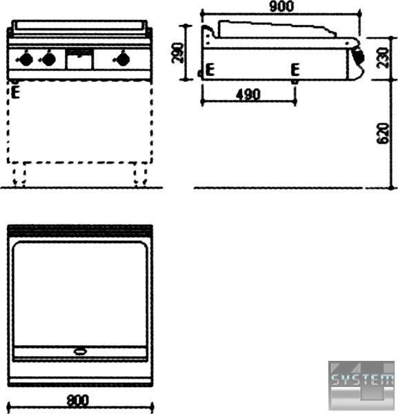 Основна частина зроблена з сатинованого хромонікелевого листа 18/8 н/с, а внутрішнє приладдя – з алітованого листа. Попереду жарочної поверхні знаходиться канал для збору олії та випускний отвір. Зібране з поверхні масло стікає у висувну скриньку, яку легко чистити. Є борти з трьох сторін для того, щоб запобігти розплескуванню жиру під час смаження. Окремий контроль поверхні за допомогою двох окремих ручок керування. Усі електричні механізми та прилади відповідають міжнародним стандартам. Температура регулюється в межах 50-300 °С за допомогою багаторівневого термостата та запобіжного термостата 350 °C. Основний перемикач використовується для подачі чи припинення енергії. Придатна для багатофункціонального використання із шафою (з дверима або без) або на консолі для установок ізольованого типу.