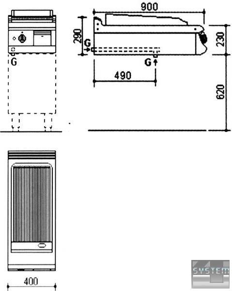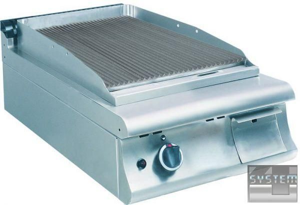 Основна частина зроблена з сатинованого хромонікелевого листа 18/8 н/с, а внутрішнє приладдя – з алітованого листа. Попереду жарочної поверхні знаходиться канал для збору олії та випускний отвір. Зібране з поверхні масло стікає у висувну скриньку, яку легко чистити. Є борти з трьох сторін для того, щоб запобігти розплескуванню жиру під час смаження. Окремий контроль поверхні за допомогою двох окремих ручок керування. Газові втулки з факелом, мінімально-максимальне полум'я і термоелемент; у разі відключення газу газовий вентиль припиняє подачу газу. Газові пальники нержавіючої труби придатні для роботи з використанням різного типу газу. Кнопка автоматичного запалювання. Може використовуватися СНД чи природний газ, і перетворення відбувається без змін. Придатна для багатофункціонального використання із шафою (з дверима або без) або на консолі для установок ізольованого типу.