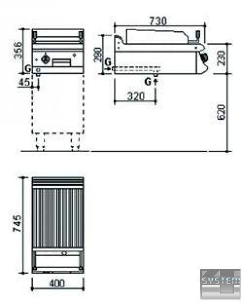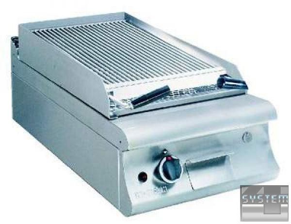 Основна частина зроблена з сатинованого хромонікелевого листа 18/8 н/с, а внутрішні приладдя – з алітованої сталі. Попереду жарочної поверхні знаходиться канал для збору олії та випускний отвір. Зібране з поверхні масло стікає у висувну скриньку, яку легко чистити. Механізм для підняття важеля для витягування поверхні для смаження з джерела тепла. Окреме керування жарочною поверхнею за допомогою 2 окремих ручок. Є борти з трьох сторін для того, щоб запобігти розплескуванню жиру під час смаження. Газові втулки з факелом, мінімальне/максимальне полум'я і термореле; у разі згасання полум'я газовий вентиль припиняє подачу газу. Газові пальники трубчастого типу придатні до використання різного типу газу. Кнопка автоматичного запалювання. Може бути використаний СНД чи природний газ, і перетворення відбувається без будь-якої модифікації. Придатний для багатофункціонального використання із шафою (з дверима або без) або на консолі для встановлення ізольованого типу.