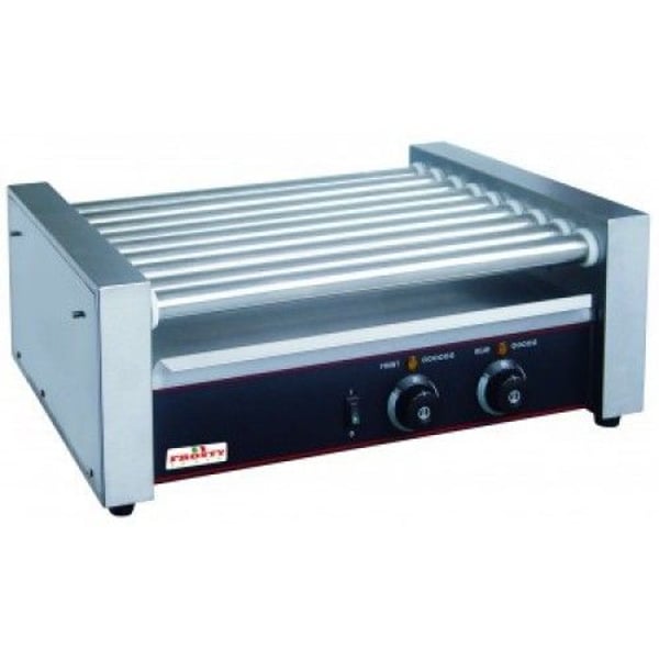 Робоча поверхня складається з 9-ти хромованих ролика, другопластові втулки збільшують термін роботи роликів. Рівномірне нагрівання роликів по всій довжині забезпечує швидке нагрівання та віддачу тепла. Діаметр продуктів повинен бути не менше 18 мм, кількість в режимі приготування – 8 коротких сосисок. Ролики постійно обертаються в робочому режимі і між ними обсмажуються сосиски. У піддон, що легко витягується для чищення, капає зайвий жир. Два регулятори потужності. Терморегулятор встановлений з лицьового боку, що дозволяє вибрати ступінь нагрівання гриля від +50 до +250°С.