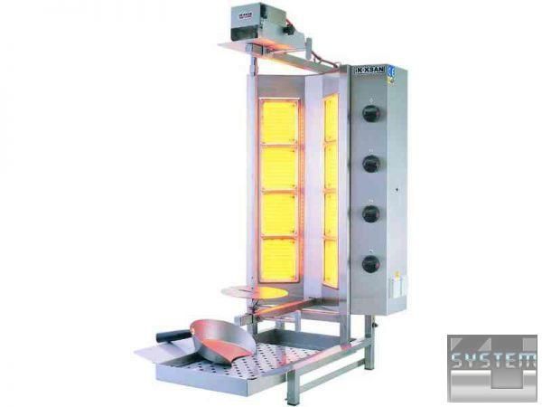 Повністю виготовлений з хромонікелевого листа 18/8 н/с AISI304. Зміцнена профілями з н/с розміром 25x25x1,2 мм. Вертел з н/с розміром 12*12*745 мм. Горизонтальні керамічні нагрівальні прилади (по 2 прилади в кожному ряду, всього 4 ряди), що регулюються окремо. Лопатка, сушильний лист та піддон для збору олії з н/с. Спеціальний мотор (1 об/хв), стійкий до високої температури і обертається праворуч/ліворуч. Ковзаючі верхні та нижні станини рожна для закладки або зняття м'яса з нагрівальних приладів. Обладнана вплавленою розеткою для електричного ножа для обробки донеру/кебабу/шаурми.