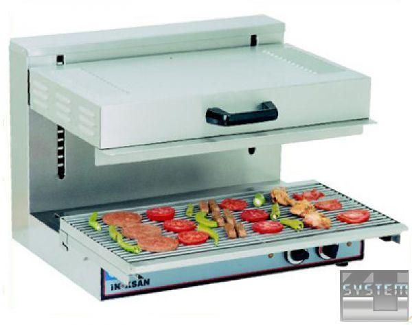 Зроблена із сатинованого хромонікелевого листа 18/8 н/с AISI 304. Верхня частина покриває нагрівальні прилади, що пересуваються вгору та вниз. Балансування за допомогою поперечної ваги запобігає верхній частині від неконтрольованих рухів. Можливість регулювання відстані між нагрівальним елементом та їжею. Оскільки розтоплені жири/олії не стикаються з нагрівальними приладами у верхній частині, немає ризику опіку олією і, таким чином, забезпечується безпечне використання. Піддон і решітка, що легко висувається і очищається. Грати зроблені із пластин з н/с. Нагрівальні прилади регулюються за допомогою перемикача для тривалої чи тимчасової подачі енергії.