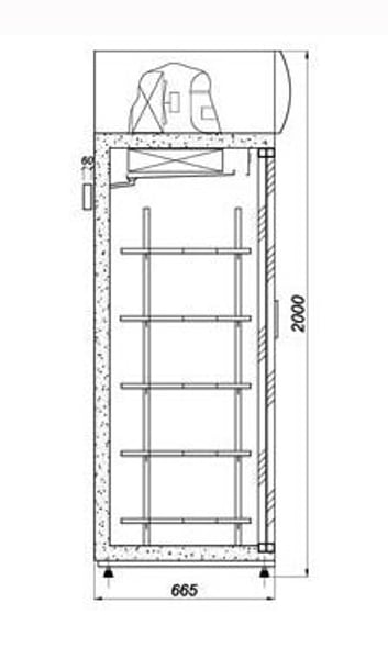 Зовнішній корпус холодильної шафи виконаний з оцинкованої сталі (забарвленої порошковим методом у білий колір), внутрішня частина шафи виготовлена з алюмінієвого листа, тильна частина та дно - з нержавіючої сталі. Є можливість регулювати положення металевих сітчастих пластифікованих полиць, також є вимикач освітлення внутрішньої частини шафи. Професійна холодильна шафа оснащена високоякісним, енергозберігаючим агрегатом німецької компанії Danfoss, яка розташована зверху. У процесі роботи холодильного обладнання конденсат випаровується автоматично.