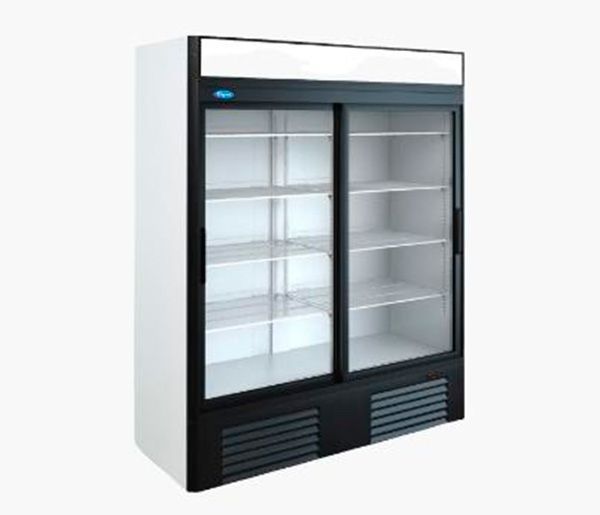 Засклена конструкція двох дверей-купе, герметично прилеглі з автоматичним пристроєм, що блокує, 8 полиць, товщина термоізоляції 60 мм, автоматичне випарювання талої води.