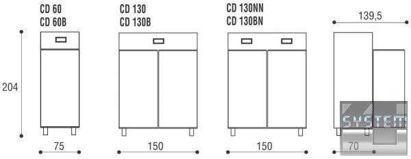 Моделі CD150NN, CD150BN; CD150BB; CD150CP; CD130NN; CD130BN мають два відокремлені один від одного відсіки, що охолоджуються двома незалежними холодильними агрегатами: висока універсальність експлуатації, гарантія функціональності з часом і велика економія електроенергії по відношенню до моделей, що мають один холодильний агрегат