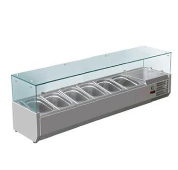 Настільна холодильна вітрина для топінгу використовується для попереднього охолодження, демонстрації та короткочасного зберігання заготовок, салатів, закусок, гарнірів у ресторанах, магазинах, барах, суші-барах. Найбільш широко застосовуються в піцеріях для зберігання топінгу – начинки для піци.