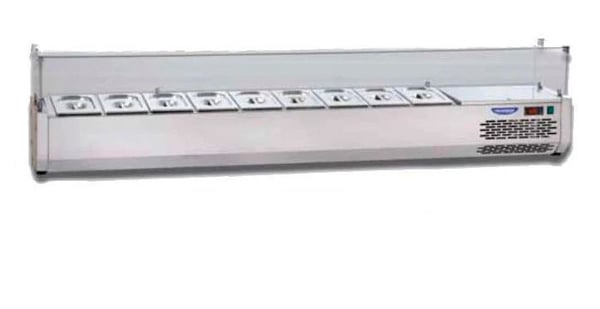 Настільна холодильна вітрина для топінгу використовується для попереднього охолодження, демонстрації та короткочасного зберігання заготовок, салатів, закусок, гарнірів у ресторанах, магазинах, барах, суші-барах. Найбільш широко застосовуються в піцеріях для зберігання топінгу – начинки для піци.