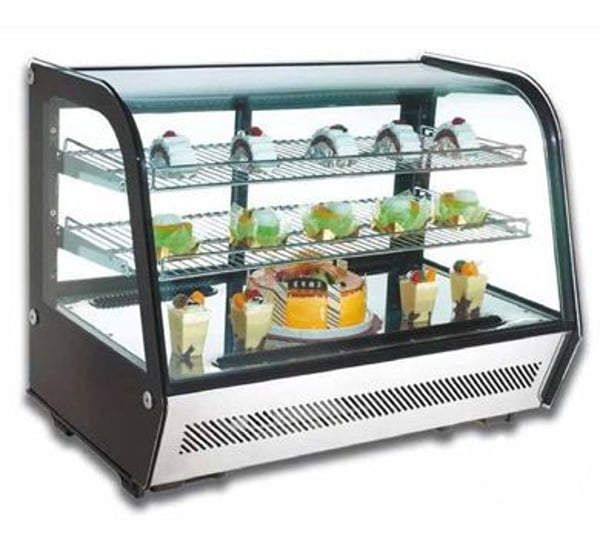 Кондитерська вітрина обладнана двома вежами на задній частині, для закладки продуктів. Регульовані по висоті 2 полиці-ґрати та гнуте скло забезпечує гарний огляд товару.