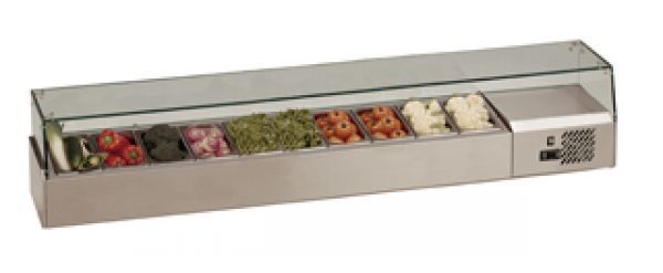 Настольные барные витрины - предназначены для кратковременного хранения и демонстрации, предварительно охлажденных продуктов (салатов, закусок, гарниров) в магазинах, кафе, барах, ресторанах, суши-барах. Наиболее широко применяются в пиццериях для хранения топпинга (начинки для пиццы).