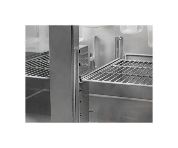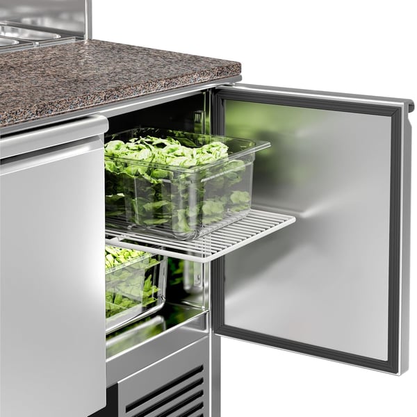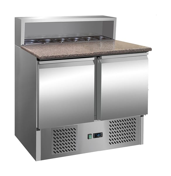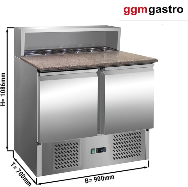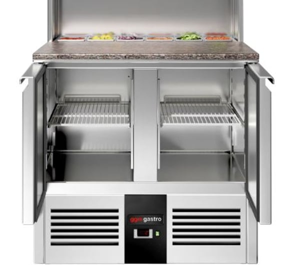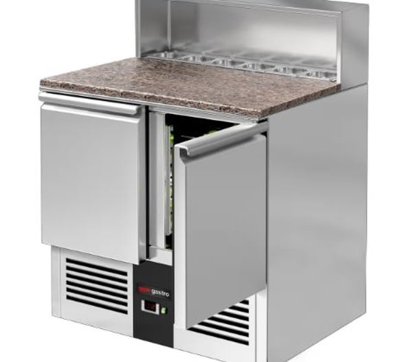 Стіл холодильний 2-х дверний GGM SAG97GND призначений для зручності приготування найпопулярнішої страви у меню багатьох закладів – піци: підходить для розкочування тіста, обробки інгредієнтів для приготування страв та довготривалого зберігання продуктів і напоїв на підприємствах громадського харчування та торгівлі. Перевага даного холодильного столу полягає у поєднанні робочої поверхні з холодильною камерою, що забезпечує комфортні умови для роботи кухаря та дозволяє використовувати робочий простір з максимальною користю – інгредієнти можна легко діставати і обробляти прямо на столі. Крім того, холодильний стіл може використовуватися для розміщення різного допоміжного обладнання. Виконання PREMIUM забезпечує високу продуктивність із низьким енергоспоживанням (екологічність).