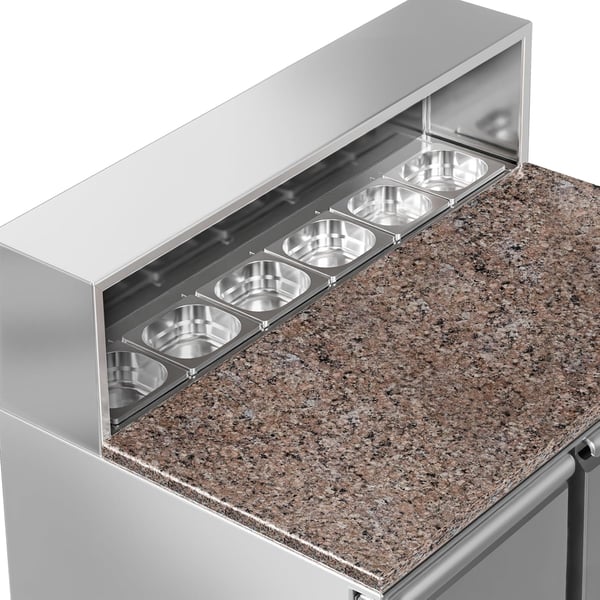 Металеву надставку можна використовувати як полицю для інгредієнтів си робочого інвернтарю. 5 x GN 1/6 гастроємностей, які охолоджуються та служать вітриною, де зберігаються начинки.