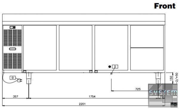 Професійний стіл з охолодженням має габаритні розміри: 2204мм (довжина), 700мм (глибина), 850мм (висота).