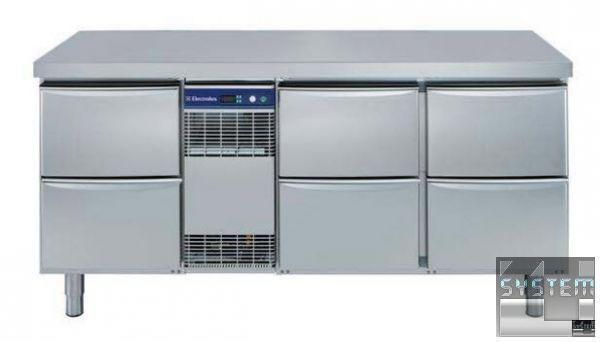 Холодильний стіл Electrolux 726562, без борту , об'ємом 440л., 6 висувних ящиків 1/2, температурний режим роботи -2…+10°С, система автоматичного розморожування та випаровування, ізоляція товщиною 60мм., електронне мікропроцесорне управління з дисплеєм, 43°С, закруглені кути, модульна конструкція дверей, знижене енергоспоживання, виконання нерж. сталь AISI 304