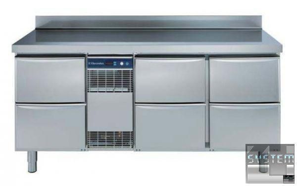Холодильний стіл Electrolux 726566, з бортом 100 мм, об'ємом 440л., 6 висувних ящика 1/2, температурний режим роботи -2…+10°С, система автоматичного розморожування та випаровування, ізоляція товщиною 60мм. клас +43 ° С, закруглені кути, модульна конструкція дверей, знижене енергоспоживання, виконання нерж. сталь AISI 304