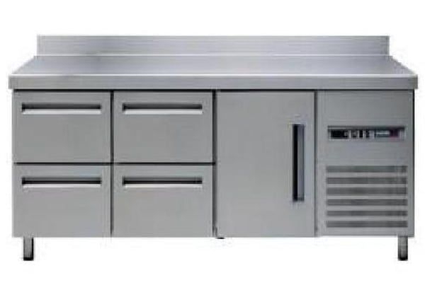 Холодильний однодверний стіл із заднім бортом 10 см і 4-ма ящиками, внутрішнє оздоблення, регульовані ніжки та зовнішня частина стільниці із закругленими кутами внизу виготовлені з високоякісної нержавіючої сталі, стійкої до низьких та високих температур, до корозії та з найкращим коефіцієнтом. панелі.