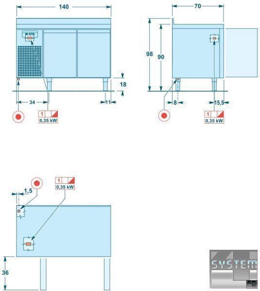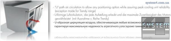 Пропонуються варіанти без робочого столу, з одностороннім робочим столом, або з одностороннім робочим столом та плінтусом стільниці. Внутрішня камера має штамповане днище для полегшення чищення. Зубчасті рейки із нержавіючої сталі AISI 304 легко знімаються. Ніжки із нержавіючої сталі AISI 304 регулюються по висоті. Панель керування обладнана цифровим термометром-термостатом. Температура температури: від +0 до +10°C. Автоматична відтайка та система випаровування конденсату. У комплектацію входять 1 пара напрямних з нержавіючої сталі AISI 304 та 1 решітка на відсік. Комплект замків - на замовлення.
