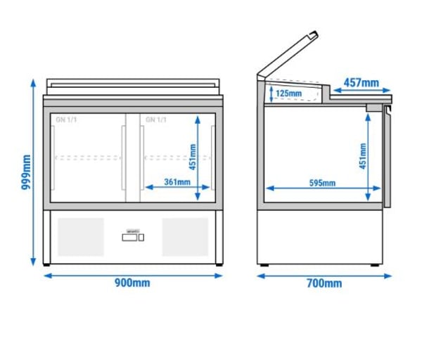 Конструкцією передбачено металеву надставку для 5 x GN 1/6 гастроємностей, які охолоджуються та служать вітриною, де зберігаються начинки.