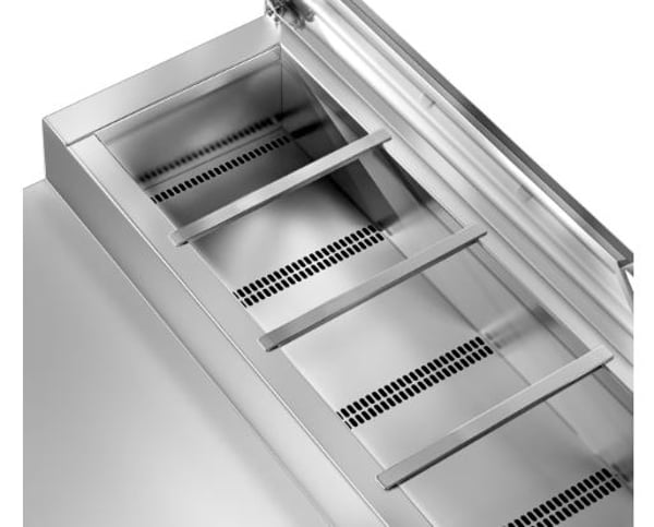 Функціонал столу дозволяє не лише зберігати різноманітні заготовки та інгредієнти, що найчастіше використовуються для приготування піци, а й працювати з ними на робочій поверхні.