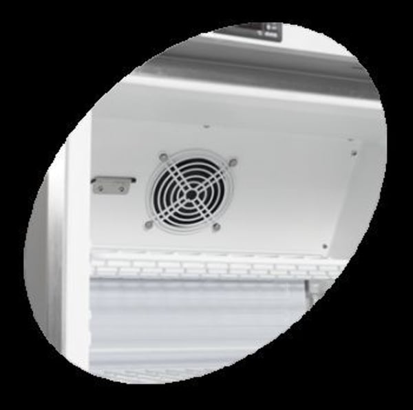 Вентилятор сприяє швидкій та рівномірній циркуляції холоду по всій робочій поверхні камери.