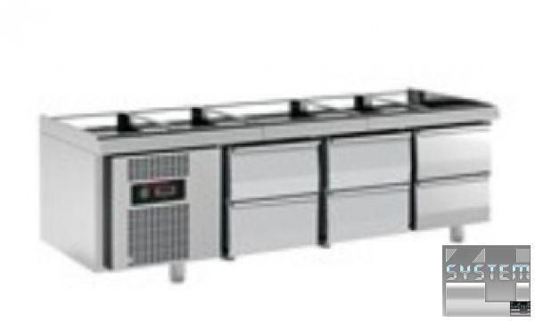 Холодильный стол Angelo Po 4G6SB6 с рамой для поддержки 5 настольных элементов тепловой модульной линии GAMMA 700, обеспечивает корректное хранение продуктов, рационализируя кухонное помещение и работу поваров.