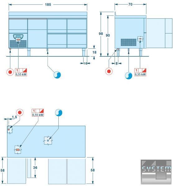 Холодильные столы Angelo Po линейки 6TE - столы со встроенными холодильными агрегатами глубиной 70 см с выдвижным ящиком GN 1/1, который расположен на холодильном блоке, что увеличивает емкость данного оборудования. Объем ящика 24,6 л, размеры: 30,5x54,8x14,7 см.