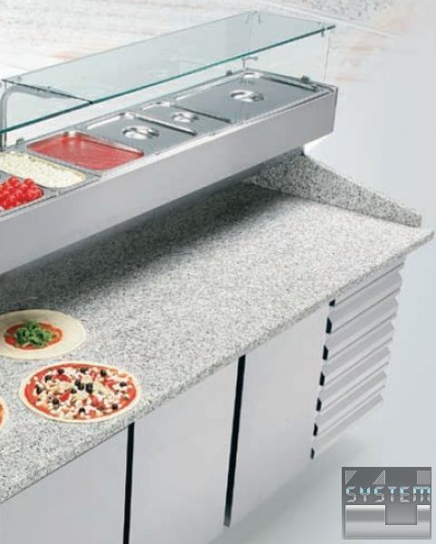 BPZ167B - холодильный стол для пиццы с одним холодильным отделением, одной нейтральной тумбой с 3 ящиками и 1 большим ящиком с полезной высотой 350 мм, 1 охлаждаемой витриной для наполнителей 37 см глубиной и гранитной поверхностью.