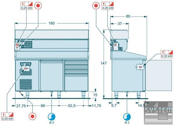Имеются два варианта глубины витрины: 33 (1/2 GN) и 37 (1/1 GN) см;
