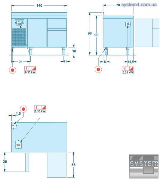 Несущий каркас выполнен из нержавеющей стали AISI 304 . Толщина изоляции 60 мм, она изготовлена из полиуретана без использования CFC. Глубина 70 см - GN 1/1. Рабочий стол высотой 60 мм выполнен из нержавеющей стали AISI 304 с звукопоглощающей разделительной панелью. Предлагаются варианты без рабочего