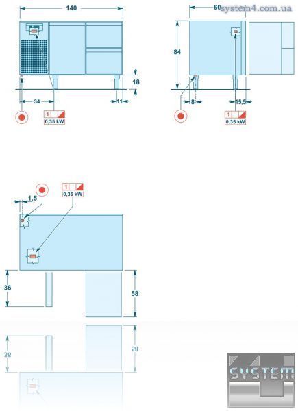 Несущий каркас, выполненный из стали, защищенной от отпечатков пальцев. Толщина изоляции - 60 мм из полиуретана без использования CFC. Глубина 60 см и 70 см - GN 1/1. Рабочий стол высотой 60 мм выполнен из нержавеющей стали AISI 304 с звукопоглощающей разделительной панелью.