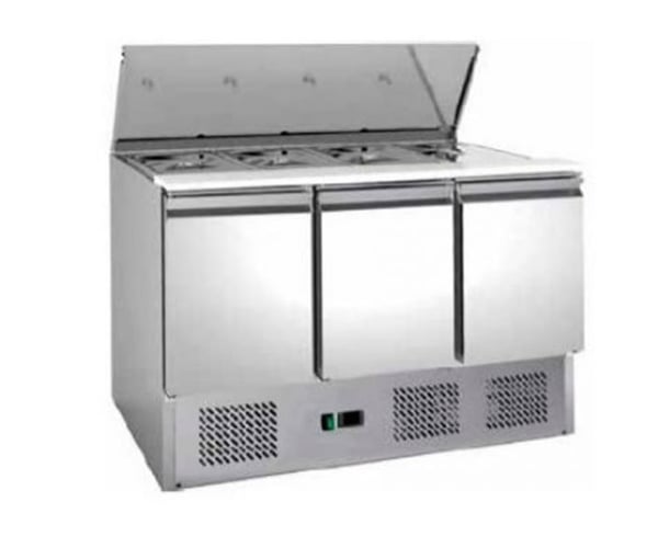 Стіл холодильний з трьома орними дверима з поворотним механізмом, також підігрів по контуру дверей перешкоджає утворення конденсату. Холодильний агрегат знаходиться внизу, охолодження відбувається за рахунок вентиляції обсягу робочої камери, є функція автоматичної відтаювання.
