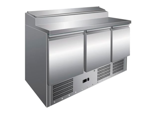 Стіл холодильний з трьома орними дверима з поворотним механізмом, також підігрів по контуру дверей перешкоджає утворення конденсату. Холодильний агрегат знаходиться внизу, охолодження відбувається за рахунок вентиляції обсягу робочої камери, є функція автоматичної відтаювання.