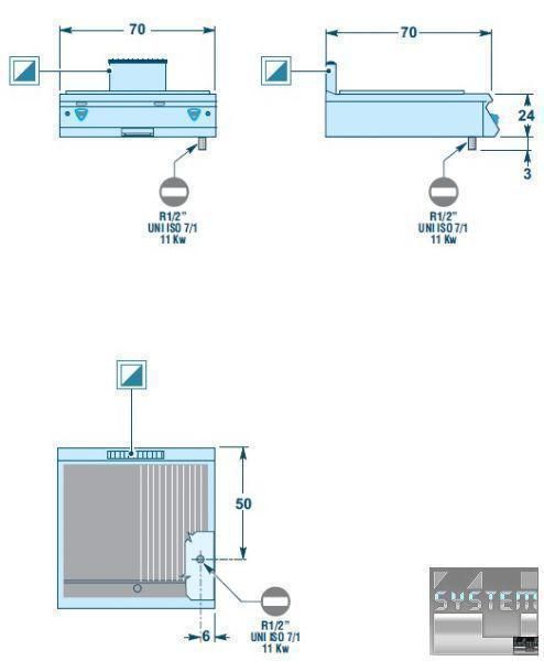 Нагревание посредством двух независимых групп горелок (каждая нагревает половину поверхности) мощностью 11 кВт, контроль термостатическим клапаном.
