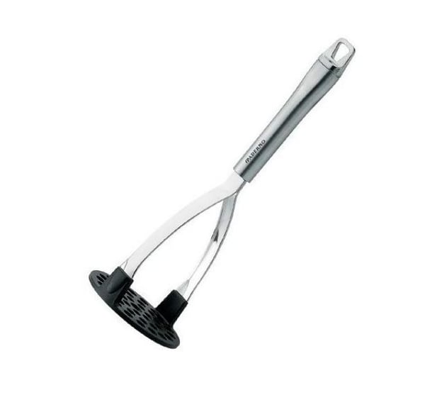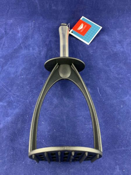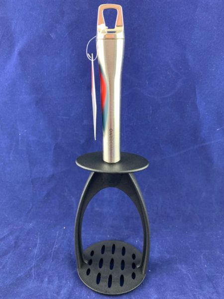 Основа картоплем'ялки виконана з високоякісної нержавіючої сталі 18/10, має заокруглену ручку з пластмаси для зручного хвату, робоча частина з отворами.