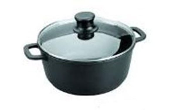 Каструля з кришкою виготовлена з литого алюмінію з матовою поверхнею.