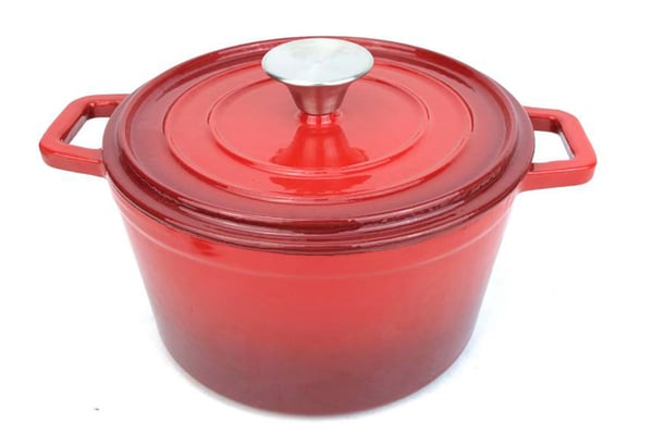 Корпус круглої каструлі та ручки виготовлені з чавуну, який покритий емаллю. Також чавун це екологічно чистий та безпечний матеріал, який не виділяє токсичних речовин у процесі смаження.