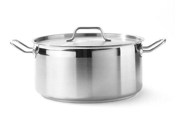 Каструля з кришкою, виготовлена з високоякісної хромованої сталі.