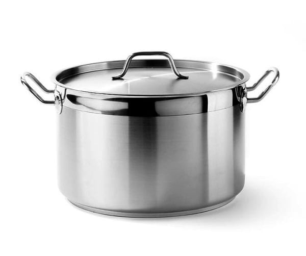 Каструля з кришкою, виготовлена з високоякісної хромованої сталі.