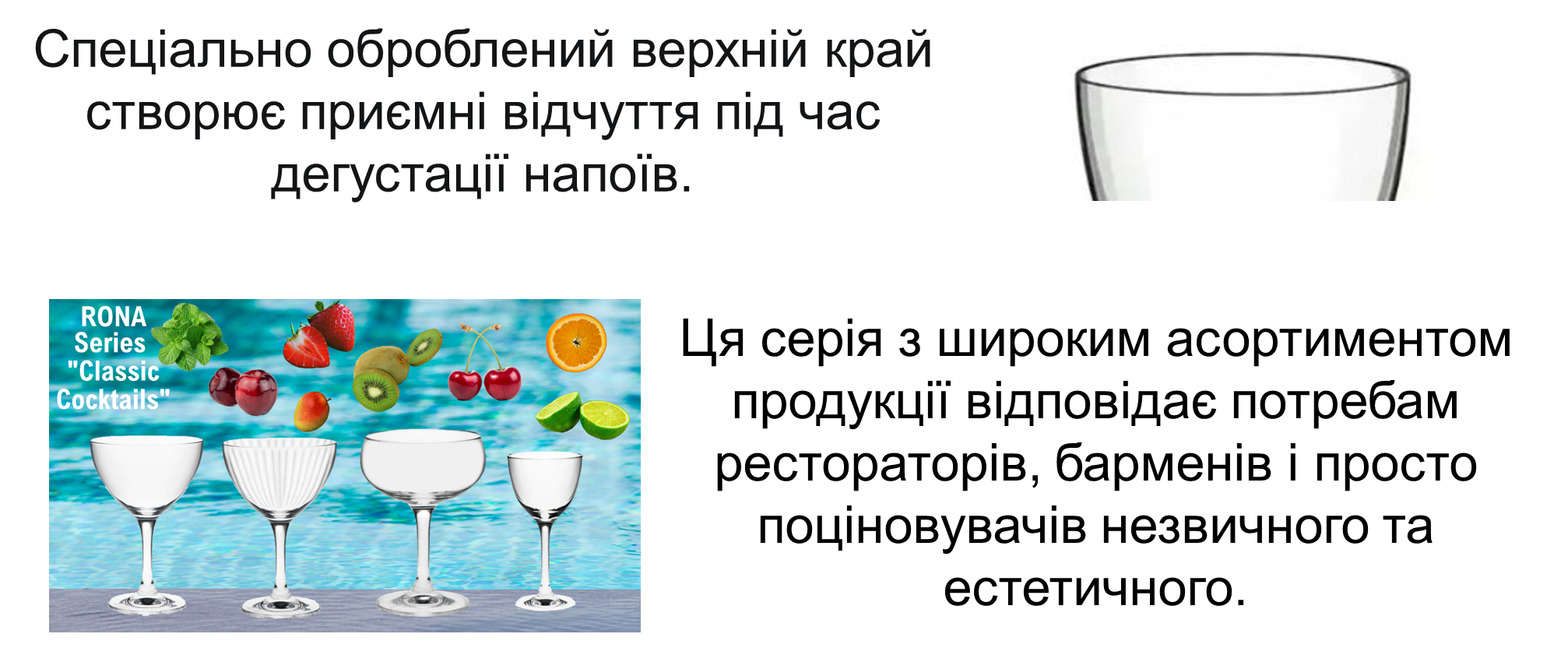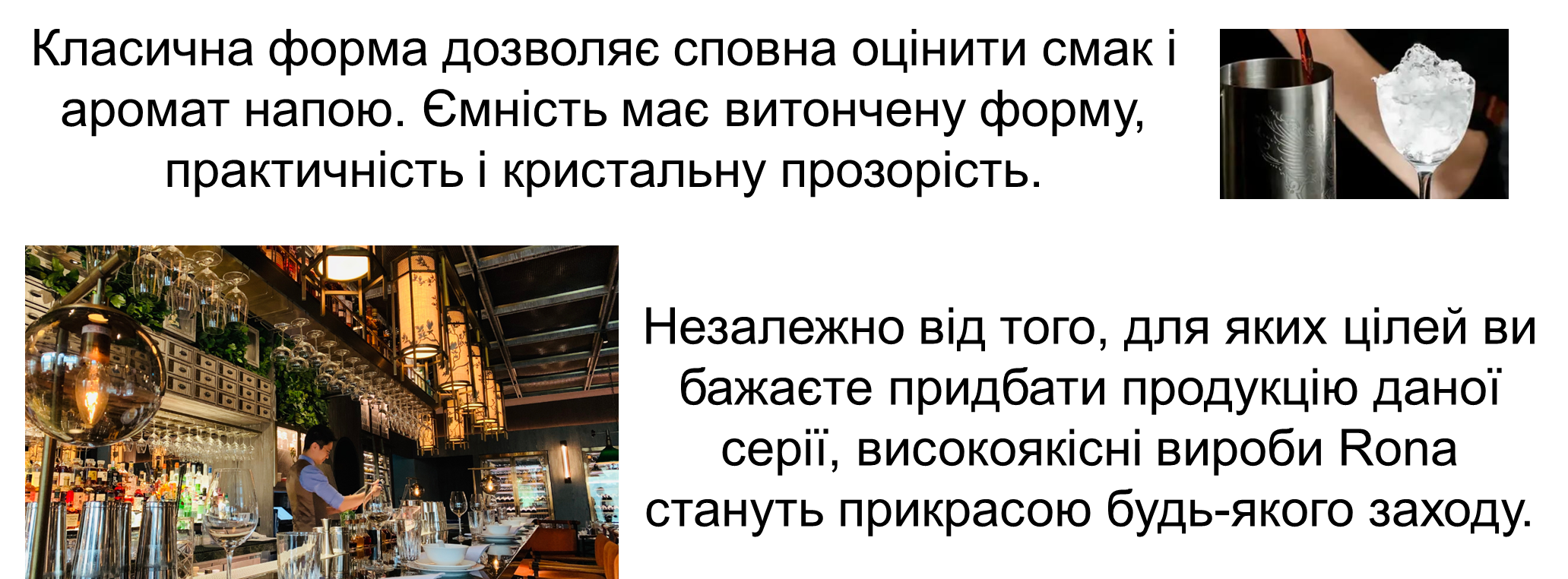 Rona – це всесвітньо визнаний виробник професійного скляного посуду зі Словаччини, відомий своєю високою якістю та бездоганною репутацією. Колекції барного скла від цього європейського бренду вирізняються витонченістю, різноманітністю декорів та форм, а також високою якістю ручної роботи. Компанія RONA має сертифікат ISO 9001, що підтверджує найвищу якість продукції за європейськими стандартами.