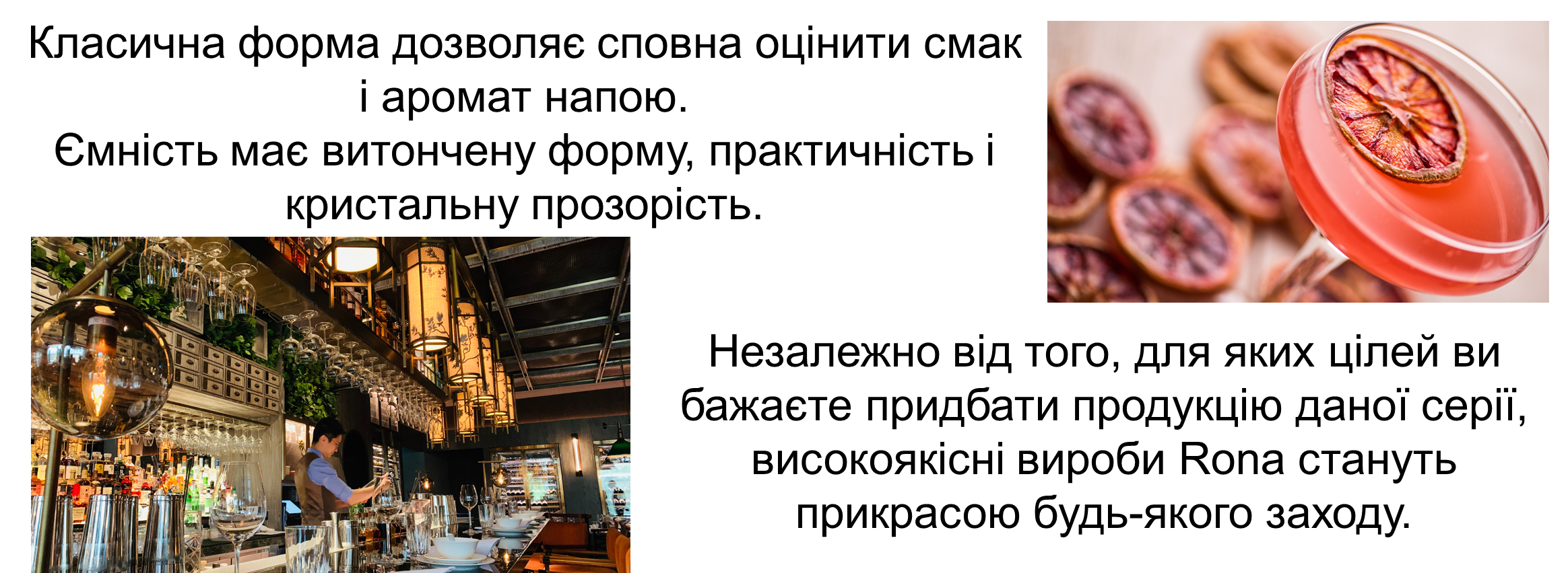 Rona – це всесвітньо визнаний виробник професійного скляного посуду зі Словаччини, відомий своєю високою якістю та бездоганною репутацією. Колекції барного скла від цього європейського бренду вирізняються витонченістю, різноманітністю декорів та форм, а також високою якістю ручної роботи. Компанія RONA має сертифікат ISO 9001, що підтверджує найвищу якість продукції за європейськими стандартами.
