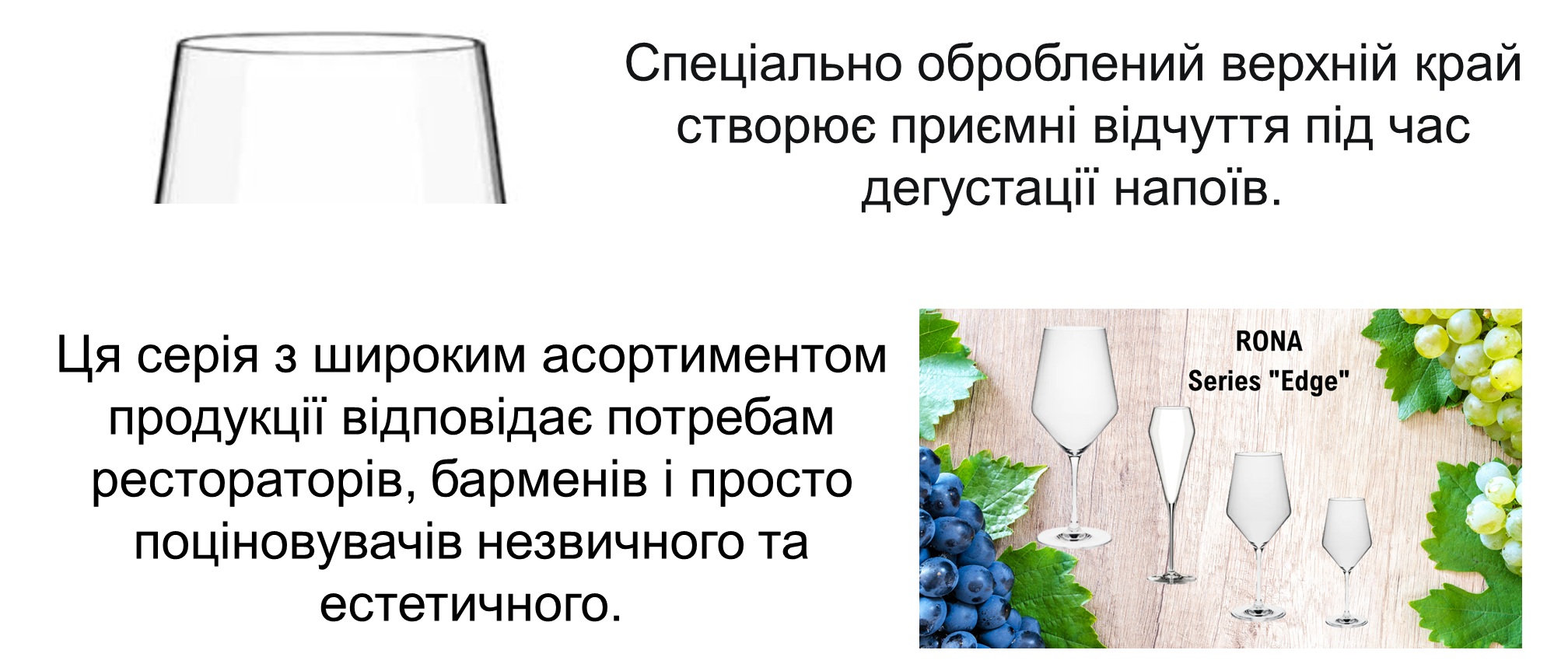 Барне скло колекції Edge призначене для сервірування столу та відноситься до сегменту професійного посуду для ресторанів. Колекція “Edge” – втілення елегантності та якості. Легка цільна конструкція вирізняється надзвичайною стійкістю до сколів завдяки лазерній обробці краю. Ці келихи – більше, ніж елементи сервірування, вони відрізняється