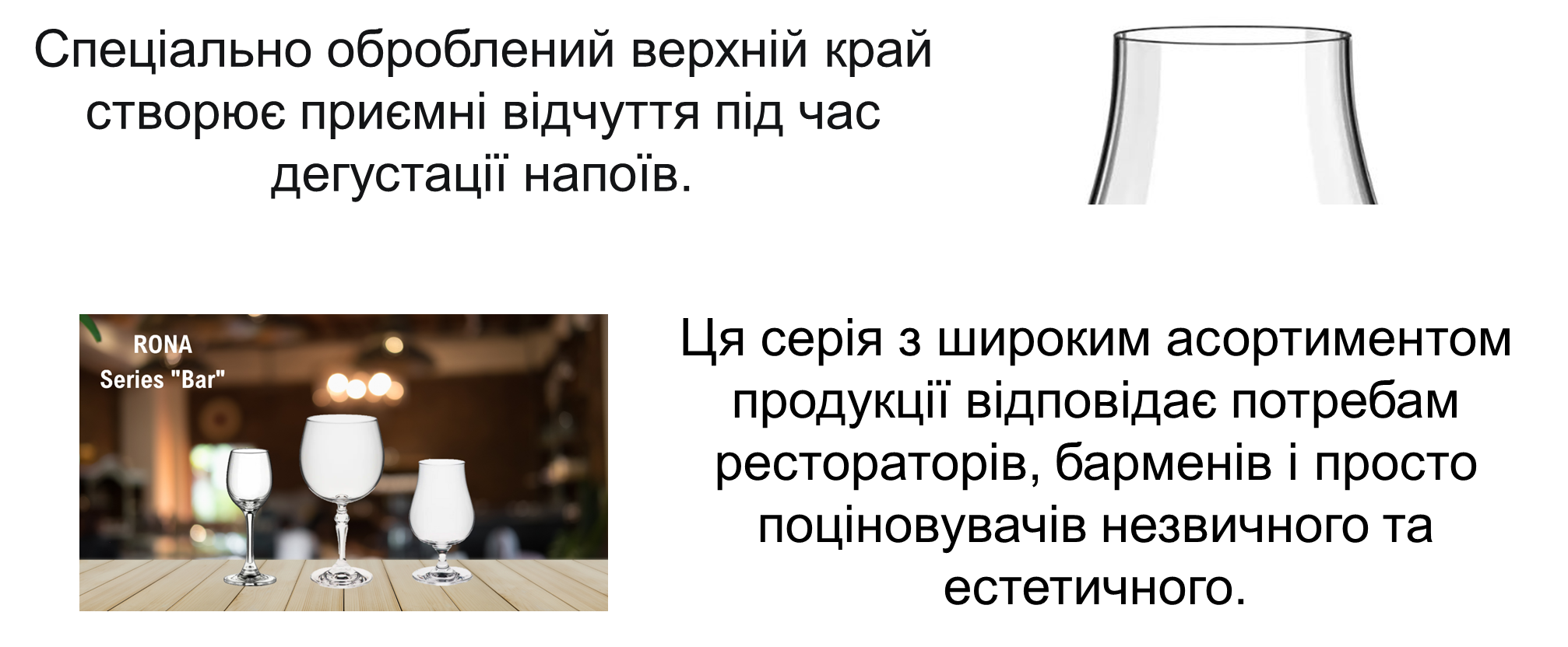 Серія “Bar" – втілення елегантності та якості. Колекція BAR включає набір із найбільш популярного барного скла для справжніх професіоналів. Витончене скло подарує вашим напоям незрівнянне сяйво, розкриваючи їх аромати та смаки. Кожна деталь колекції BAR ретельно продумана, відображаючи прагнення до досконалості та унікальності.