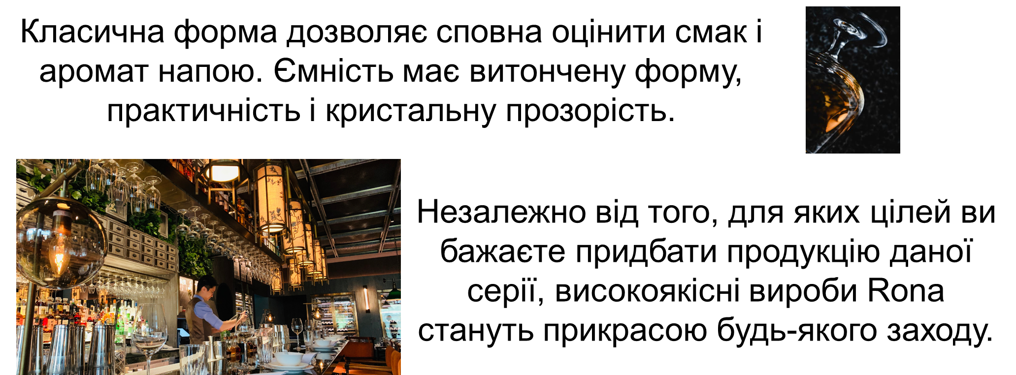 Rona – це всесвітньо визнаний виробник професійного скляного посуду зі Словаччини, відомий своєю високою якістю та бездоганною репутацією. Колекції барного скла від цього європейського бренду вирізняються витонченістю, різноманітністю декорів та форм, а також високою якістю ручної роботи. Компанія RONA має сертифікат ISO 9001, що підтверджує найвищу якість продукції за європейськими стандартами.