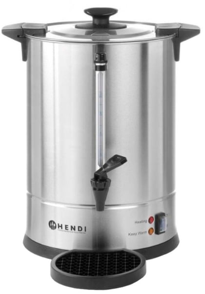 Електрокип'ятильник Hendi 211250 - кип'ятильник, призначений для приготування кип'яченої води з температурою близько 100 °C , яка надалі використовуватиметься підприємствами громадського харчування для глінтвейну, чаю, кавових напоїв та підігріву води. Завдяки своєму унікальному дизайну та акценті на деталях - ця кавоварка привертатиме увагу на будь-якому заході. Кип'ятильник електричний - апарат періодичної дії, який потребує повторного заповнення ємності водою. Нагрів води у внутрішньому обсязі електрокип'ятильника здійснюється завдяки вбудованому в дно ТЕНу. Це розміщення Тена - захищає його від накипу. Усередині вбудована сітка, що фільтрує, для заварювання кави грубого помелу, виготовлена з нержавіючої сталі. Щоб, кавова гуща, не просочувалася в напій, на сітку, що фільтрує, рекомендується встановити паперовий фільтр.