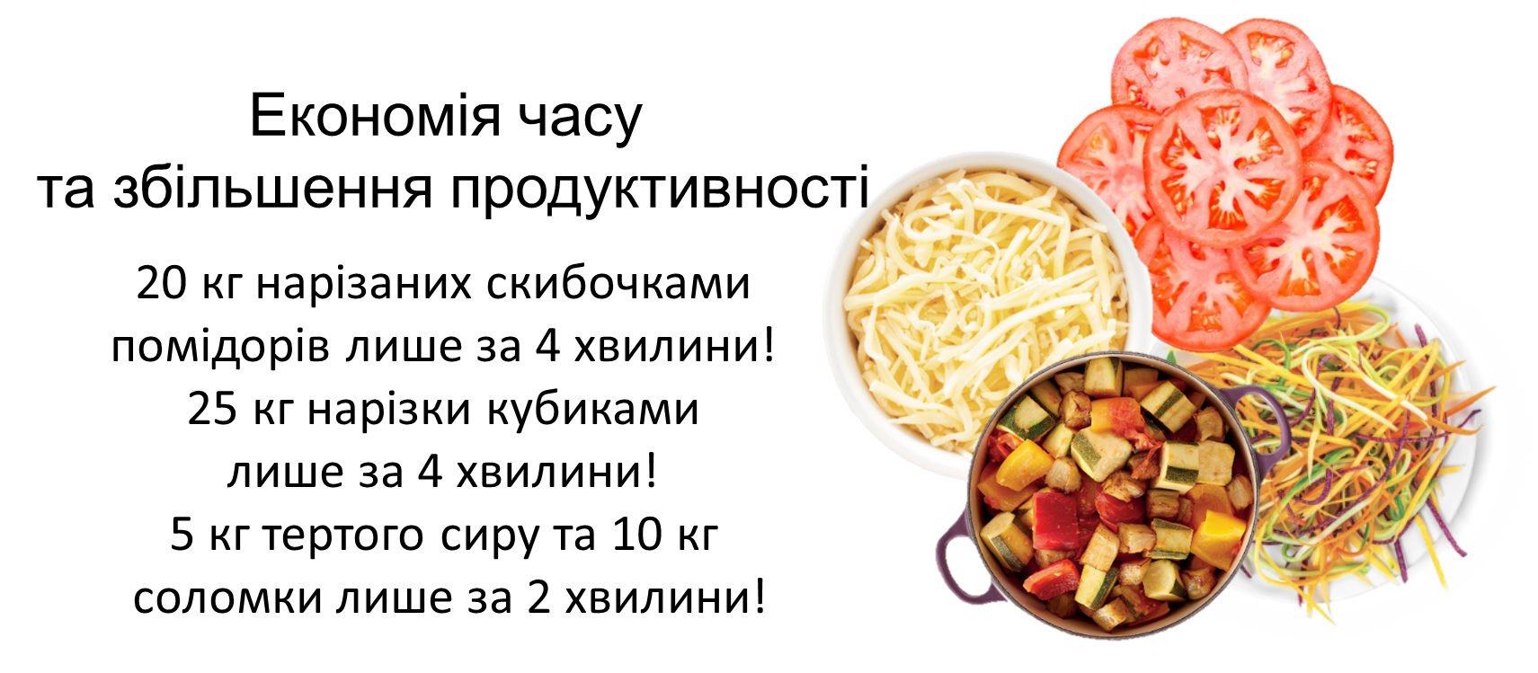 Комплект для нарізки різних видів інгредієнтів, включаючи фрукти та овочі. Форма дисків обирається в залежності від завдання, тому ви можете нарізати, пошинкувати, перетирати, нарізати соломкою або кубиками будь-які продукти.