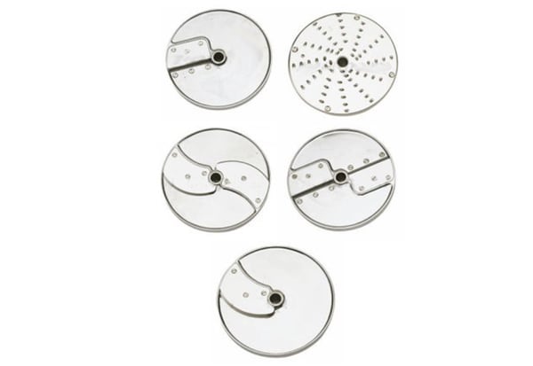 Комплект містить 5 дисків, сумісних з моделями овочерізок CL 20, CL 25, CL 30, CL 40, R201, R301 Ultra та R402. Виготовлені з нержавіючої сталі.